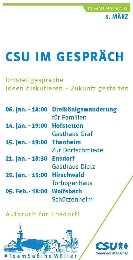 Als aktive Mitmachpartei haben sie die Möglichkeit sich über unsere politische Arbeit zu informieren und sind zu Veranstaltungen recht herzlich eingeladen. Als ihre Stimme im Gemeinderat stehen wir aufgeschlossen ihren Wünschen und Anliegen gegenüber und gestalten Lösungen für Ensdorf.